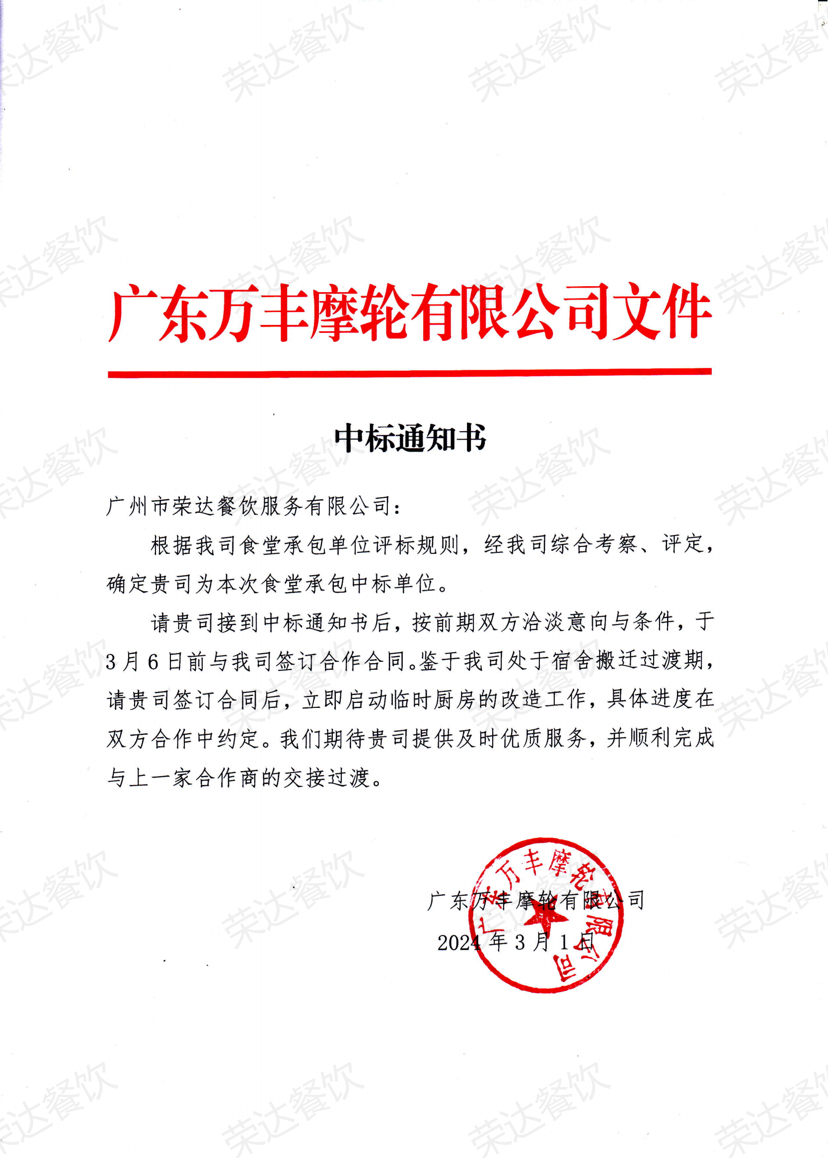 恭喜榮達(dá)餐飲中標(biāo)江門萬豐公司食堂承包項(xiàng)目